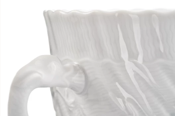 A delicate addition to one of the Meissen porcelain manufactory's most extensive dinner service creations - this beautiful cappuccino cup is part of the famous "Swan Service" by master modeller Johann Joachim Kaendler. The delicate white cappuccino cup made of the purest porcelain bears the traditionally designed motif of a pair of swans moving through gently undulating waves and reeds. The elegant tableware of this magnificent dinner service is capable of transporting the elegance of the Baroque period into the present day - traditional and timeless at the same time. The detailed elaboration of the relief stems from the high standards of the Meissen quality promise, which offers more than 2,200 pieces belonging to the "Swan Service". As wonderful as each piece of the famous dinner service is to combine with one another, this delicate cappuccino cup also shines on its own. Here, the traditionally designed relief is united in a monadic combination of top and saucer with a discreet dolphin handle, making this tableware a very special product of Meissen craftsmanship.