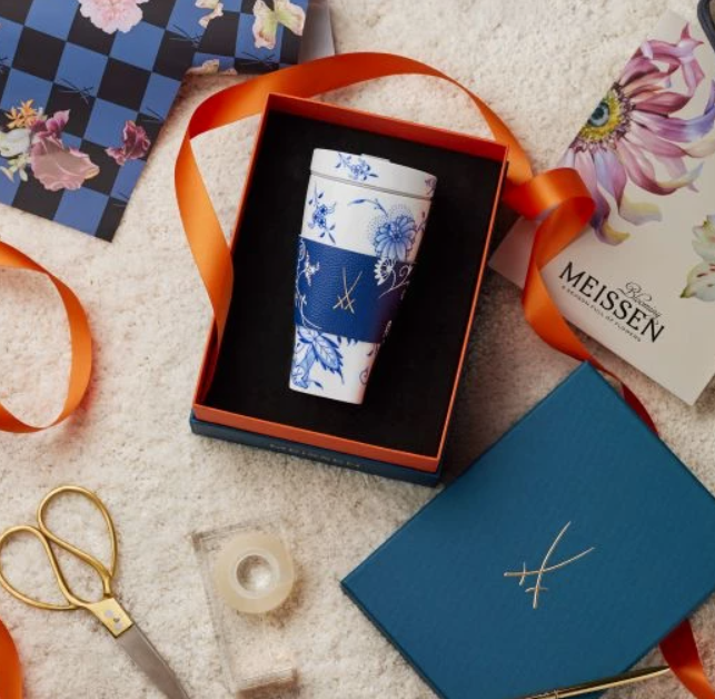 MEISSEN2Go - Coffee with style. With the brand new "Coffee to go Mug Blue Onion Style with cuff" you can enjoy the great craftsmanship behind the "Blue Onion" pattern on the go. To this day, the MEISSEN "Blue Onion" is applied to the brilliant white porcelain by specially trained underglaze painters using the manufactory's own cobalt blue and embodies the highest craftsmanship. Together with the genuine leather cuff that matches the design, the "Coffee to go Mug Blue Onion Style with cuff" is a real eye-catcher and the perfect companion for your daily adventures.