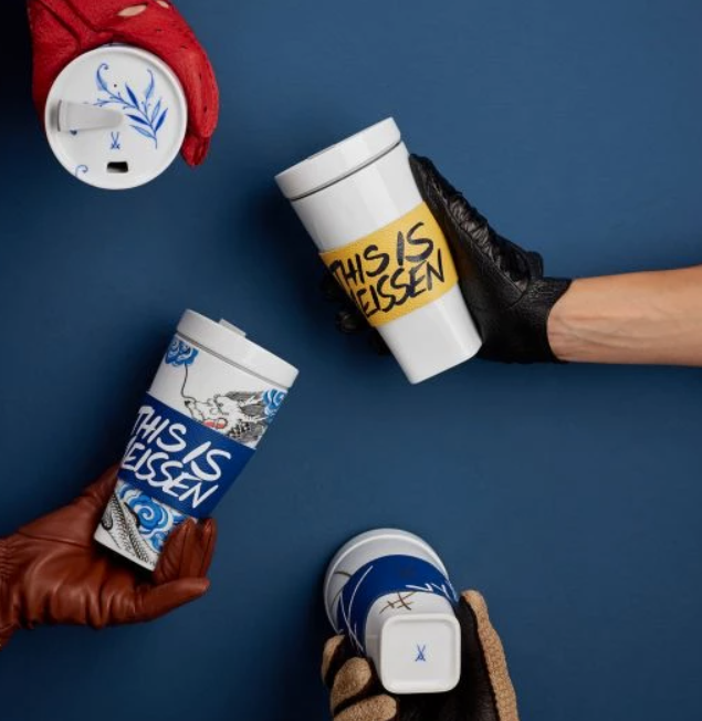 MEISSEN2Go combines coffee, adventure, and luxury seamlessly. Our MEISSEN "coffee to go mug Swords with cuff" embodies the promise of exclusive table and dining culture on the go. This elegant and luxurious mug features MEISSEN's iconic Crossed Swords motif in radiant gold. Crafted from porcelain sourced from the "Nova" collection, known for its unique blend of angular and round shapes, it ensures a noble coffee experience.